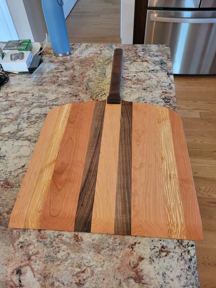 18″ Pizza Peel made in Bridgton Maine by Lamb’s Custom Woodworking – made from black walnut, cherry, and Maple. The paddle overall dimensions are 1/2″ thick 18″ wide x 33″ long. The paddle portion is 18″x18″ The handle has cherry wood in the middle and black walnut on top and bottom. In addition to adding to the aesthetics it makes the handle easier to grip 16″ x 16″ also available